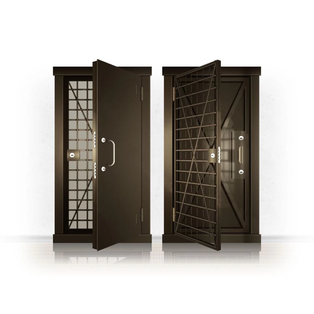Металлические двери КХО и КХН представляют собой входные блоки, обладающие высоким уровнем взломостойкости и состоят из трех основных элементов: усиленного каркаса, сплошного металлического полотна и решетчатой двери. Дверной блок изготавливается из стального уголка 100*100 мм. Места крепления блока к стене цементируются и закрываются стальными наличниками шириной 40 мм. Крепеж заходит вглубь стены на 80 мм. В конструкции внешней створки монтируются ребра жесткости, для обшивки используется сталь толщиной не менее 3 мм. Внутренняя решетка изготавливается из прутка диаметром 16 мм. Размер ячеек решетки должен составлять не более 15 на 15 см. В точках пересечения прутья надежно приваривают друг к другу. В КХО и КХН необходимо поддерживать определенную температуру и влажность. Для этого внутреннее пространство глухой двери заполняется теплоизоляционным материалом, а по периметру двери приклеивается уплотнитель. Такие двери оборудуются замками с повышенным уровнем взломостойкости. Специализированные двери КХО и КХН в Саратове могут быть оснащены сигнализацией, в конструкции могут быть проушины для навесного замка и элементами для опечатывания. Если идет речь о двери в комнату хранения оружия, в створке оборудуется окно для выдачи оружия и спец. средств, которое накрывается стальной дверцей.
